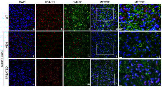 Immunofluorescence staining was performed to examine the effect of epigenetic drugs on the acetylation state of Lysine 9 of histone 3 (H3AcK9) (Figure 8b,g,l), co-localized with the nuclei (DAPI) (Figure 8a,f,k) in the lumbar MN (SMI-32) (Figure 8c,h,m) of WT, VEH and TREATED SOD1(G93A) male mice. Qualitative analysis of immunofluorescence images revealed a decrease in the acetylation of H3 in the VEH group (Figure 8g) compared to matched WT (Figure 8b). Furthermore, we observed that the treatment led to a restoration of H3 acetylation (Figure 8l), compared to animals that did not receive any treatment (VEH) (Figure 8g). The level of H3 restoration was similar to what was observed in WT animals (Figure 8b). Noteworthy, similar results were observed also in the female SOD1(G93A) mice, proving that VPA was able to regulate the activity of HDACs class-I and restore the H3 acetylation state in both sexes (see Supplementary Materials, Supplementary Data1, Figure S6).