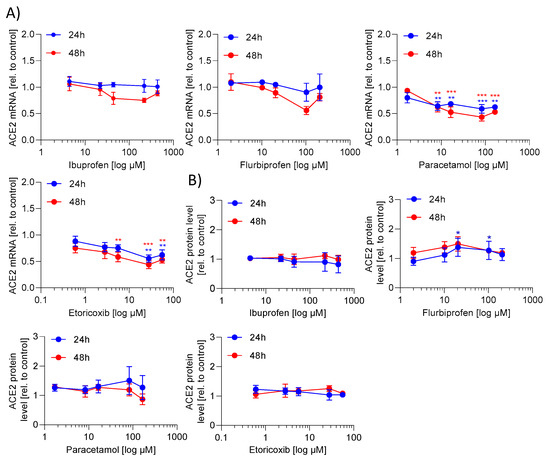 The mRNA expression of ACE2 was determined as previously described [33]. Briefly, Caco-2 cells were incubated with increasing concentrations of ibuprofen (0, 1, 5, 10, 50, 100 µg/mL corresponds to 0, 4.4, 21.9, 43.8, 219, 438.1 µM), flurbiprofen (0, 0.5, 2.5, 5, 25, 50 µg/mL corresponds to 0, 2, 10.2, 20.5, 102.3, 204.7 µM), paracetamol (0, 0.25, 1.25, 2.5, 12.5, 25 µg/mL corresponds to 0, 1.7, 8.3, 16.5, 82.7, 265.4 µM), etoricoxib (0, 0.2, 1, 2, 10, 20 µg/mL corresponds to 0, 0.6, 2.8, 5.6, 27.9, 55.7 µM) or vehicle (DMSO or water) for 24 h or 48 h.