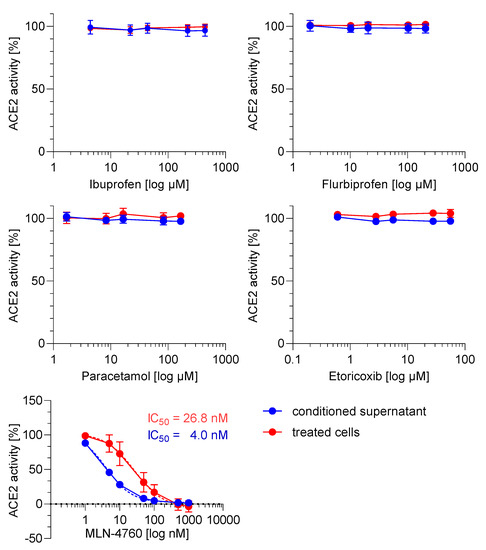 We investigated whether the test compounds influence the activity of soluble and/or membrane-bound ACE2 in Caco-2 cells. The ACE2 inhibitor MLN-4760 was used as positive control and inhibited soluble and membrane-bound ACE2 with an IC50 value of 4 and 26.8 nM, respectively. However, ibuprofen, flurbiprofen, etoricoxib and paracetamol did not influence the activity of the soluble and membrane-bound ACE2 (Figure 2).