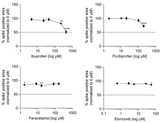 To investigate whether the tested drugs might promote or inhibit SARS-CoV-2 infection, Caco-2 cells were pre-incubated for 1 h with the test drugs and subsequently infected with SARS-CoV-2 at a multiplicity of infection (MOI) of 0.01 for 24 h. The infection level of Caco-2 cells by SARS-CoV-2 was determined via immunochemical staining of the SARS-CoV-2 spike protein. The dose ranges tested for the different drugs were the same as in the ACE2 expression and activity tests, and were selected to include the range of cmax plasma levels in humans (vide supra). Values of 438.1 and 219 µM ibuprofen as well as 204.7 µM flurbiprofen significantly reduced viral load in Caco-2 cells, while etoricoxib and paracetamol had no consistent, significant effect on viral load (Figure 3).