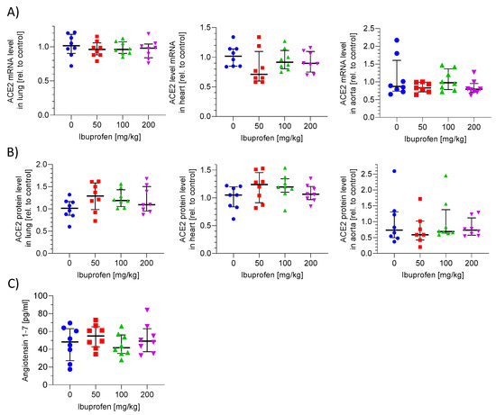 ACE2 mRNA/protein expression and activity in ibuprofen treated mice. Male C57Bl/6J mice were treated with 50, 100, 200 mg/kg ibuprofen or vehicle for 7 days. ACE2 mRNA (A) or protein (B) levels of heart, lung and aorta were determined by quantitative PCR or western blot technology, respectively. To obtain the relative values the mRNA and protein levels of treated mice were related to untreated mice. (C) Angiotensin 1–7 plasma levels determined with ELISA. Each treatment group consists of 8 mice.