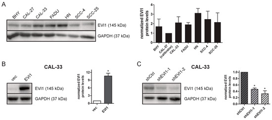 High EVI1 protein expression was associated with an increased propensity to form lymph node metastases in HNSCC [31]. To investigate the biological functions of EVI1 in this tumor entity, we first determined its expression in a panel of human HNSCC cell lines. BHY, CAL-27, CAL-33, FADU, HN, SCC-4, and SCC-25 all expressed moderate and somewhat variable levels of EVI1 mRNA and protein (Figure 1A and Figure S1A,B). Further experiments focused on cell lines derived from carcinomas of the oral cavity because of the frequency and aggressive nature of this HNSCC sub-entity [2]. CAL-33, CAL-27, SCC-25, and SCC-4 cells were transduced with a retroviral EVI1 expression vector or with an empty vector as a control. Transduced cells were sorted by flow cytometry for vector-encoded enhanced green fluorescent protein (eGFP), and overexpression of EVI1 was confirmed by immunoblot analysis (Figure 1B and Figure S1C–E). The resulting EVI1 overexpression and empty vector control cell lines are designated by appending “_EVI1” and “_vec”, respectively, to the respective cell line names (e.g., CAL-33_EVI1, CAL-33_vec). Moreover, CAL-33 cells were infected with lentiviral vectors containing one of two different shRNAs targeting EVI1 (shEVI1-1, shEVI1-2) or a control shRNA (shCtrl). After sorting for the vector-encoded fluorescent marker Venus, successful knock-down of EVI1 in the resulting cell lines CAL-33_shEVI1-1 and CAL-33_shEVI1-2 vs. CAL-33_shCtrl was corroborated by immunoblot analysis (Figure 1C).