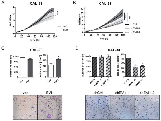 EVI1 promotes the proliferation of CAL-33 cells. (A,B) Proliferation of CAL-33_EVI1 and CAL-33_vec cells (A), or of CAL-33_shEVI1-1, CAL-33_shEVI1-2, and CAL-33_shCtrl cells (B) was monitored in real-time for 120 h. Impedance values determined by the xCELLigence system were normalized to the 24 h time point. Means ± SEM, n = 3. *** p < 0.001, according to the anova.lme function of the R package nlme. (C,D) Colony formation. CAL-33_EVI1 and CAL-33_vec cells (C), or CAL-33_shEVI1-1, CAL-33_shEVI1-2, and CAL-33_shCtrl cells (D) were seeded at low densities into six-well-plates and stained with trypan blue after 11 days. Top panels: quantification of colony numbers and sizes; bottom panels: representative well areas. Means + SEM, n = 3. * p < 0.05; Student’s two-sided t-test (C) or one-way ANOVA followed by Dunnett’s multiple comparison test (D).