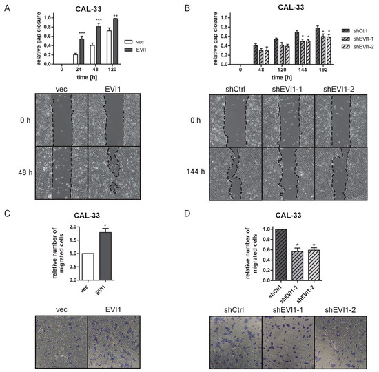 EVI1 enhances the migration of CAL-33 cells. (A,B) Scratch assay. CAL-33_EVI1 and CAL-33_vec cells (A), or CAL-33_shEVI1-1, CAL-33_shEVI1-2, and CAL-33_shCtrl cells (B) were grown to 90% confluence in a regular growth medium. The medium was changed to low serum conditions (0.2% fetal bovine serum (FBS)), scratches were introduced 24 h later, and gap closure was monitored at the indicated time points thereafter. Top panels: quantification; bottom panels: representative experiments. Means + SEM, n = 3. * p < 0.05, ** p < 0.01, *** p < 0.001, two-way ANOVA followed by Bonferroni’s post-hoc test. (C,D) Transwell migration assay. Serum-starved CAL-33_EVI1 and CAL-33_vec cells (C), or CAL-33_shEVI1-1, CAL-33_shEVI1-2, and CAL-33_shCtrl cells (D) were seeded into transwell inserts and allowed to migrate towards a medium containing 10% FBS. After 24 h, cells at the bottom of the transwell membranes were stained with trypan blue. Top panels: quantification; bottom panels: images from representative experiments. Means + SEM, n = 3. * p < 0.05; one-sample t-test (C) or one-sample t-test with Bonferroni correction for multiple testing (D).