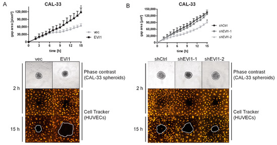 Finally, the ability of tumor spheroids to disrupt an endothelial cell monolayer was tested. One- to 2-day-old spheroids formed by CAL-33, CAL-27, and SCC-25 derivative cell lines (i.e., spheroids whose size was not yet affected by EVI1) were placed onto a monolayer of human umbilical vein endothelial cells (HUVECs). The ability of the spheroids to displace endothelial cells was monitored over time. After 15 h, CAL-33_EVI1- and SCC-25_EVI1-derived spheroids had formed significantly larger gaps in the HUVEC monolayer than their empty vector-containing counterparts. Knock-down of EVI1 in CAL-33 cells had the opposite effect (Figure 5A,B and Figure S6A,B). SCC-4 spheroids were too fragile to be used in this assay.