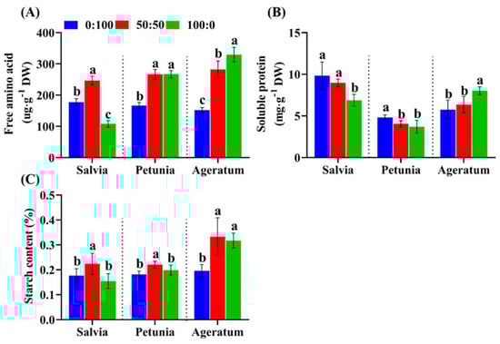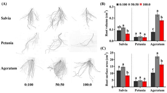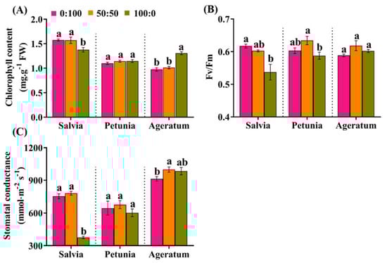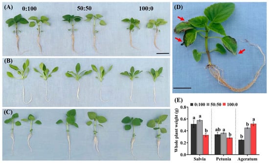 | Petunia | 0:100 | 0.72a | 2.43ab | 1.35a | 2.30b | 46.42a |