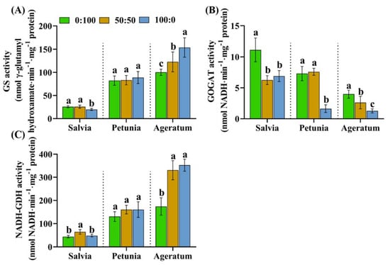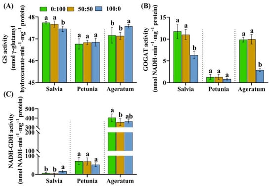 3.4.1. Leaf GS, GOGAT, and NADH-GDH Activities Are Negligible in the Contributing NH4+ Tolerances of the Three Bedding Plants