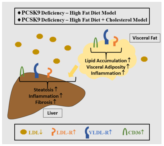 Role of PCSK9 in experimental models of NAFLD. PCSK9 deficiency in mice is associated with low circulating LDL levels and higher LDL-R, VLDL-R and CD36 expression in the liver and visceral fat depots. Separate studies reported PCSK9 deficiency to worsen liver injury. Visceral adiposity was observed in some studies [29,137,144,148,149,150]. Of note, a similar phenotype was also described in mice overexpressing PCSK9 [29]. Whether aberrantly high or low levels of PCSK9 cause a similar phenotype in the NAFLD model will be resolved in future studies.