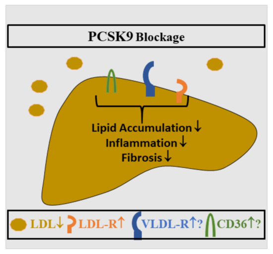 Role of PCSK9 in human liver steatosis. Therapy of severely hyperlipidemic patients with PCSK9 antibodies consistently improved liver steatosis, and a decline in liver inflammation and fibrosis was also observed. Circulating LDL levels were reduced in individuals treated with PCSK9 antibodies, suggesting higher expression of the hepatic LDL-R [153,154,155]. Whether this is associated with increased VLDL-R and CD36 levels needs further analysis.