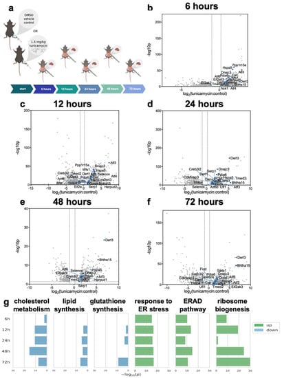 (a) Experimental overview. Mice (n = 5 per group) were treated with either DMSO or 1.5 mg/kg tunicamycin. Tissues were taken 6–72 h post-treatment. (b–f) Volcano plot of all genes for which RNA-seq measured expression. Points expressed as log2 fold-change tunicamycin treated/control on x-axis and -log10 (p-value), obtained from 2-tail t-test, on y-axis. (g) GO (gene ontology) analysis for genes for which tunicamycin treatment significantly changed gene expression. GO-terms indicate groups for which a significant number of genes where changed in relation to the remainder of the data set for each time point. GO with significant decreased gene expression: cholesterol metabolic process (GO: 0008203), lipid biosynthetic process (GO: 0008610), glutathione biosynthetic process (GO: 0006749). GO with significant increased gene expression: response to ER stress (GO: 0034976), ERAD pathway (GO: 0036503), ribosome biogenesis (GO: 0042254). All gene abbreviations used are consistent with Uniprot.