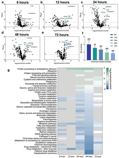 (a–f) Volcano plot of all proteins for which fractional synthesis rates were measured 12–72 h post tunicamycin treatment. Points expressed as log2 fold-change tunicamycin treated/control on x-axis and −log10 (p-value), obtained from 2-tail t-test, on y-axis. (f) Ratio of protein translation rates of BiP in tunicamycin treated/control. Ns = no significance, ** = <0.01, *** = <0.001. (g) KEGG-pathway analysis for fractional synthesis rates of significant (p = <0.05 per 2-tail t-test) proteins from tunicamycin treated/control. n = at least 5 proteins per pathway. All protein abbreviations used are consistent with Uniprot; accession numbers can be found in the Supplementary Data.