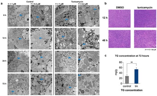 (a) Electron microscopy (TEM) images of liver sections 12–72 h post DMSO (control) or with 1.5 mg/kg tunicamycin treatment. Arrows point out ER in both treated and control to highlight changes in morphology. (b) H&E staining of liver sections 12 and 48 h post DMSO or with 1.5 mg/kg tunicamycin treatment. (c) Concentration of triglycerides in mouse liver lysate post DMSO (control) or with 1.5 mg/kg tunicamycin treatment. (Tm = tunicamycin-treated). ** = <0.01.