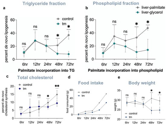 (a) De novo lipogenesis rates of palmitate incorporated into triglycerides in control and tunicamycin treated mice 12–72 h post treatment (n = 5 per group). (b) De novo lipogenesis rates of palmitate incorporated into phospholipids in control and tunicamycin treated mice 12–72 h post treatment (n = 5 per group). (c) De novo cholesterol synthesis (free and esterified) rates in control and tunicamycin treated mice 12–72 h post treatment (n = 5 per group). (d) Food intake in control and tunicamycin treated mice 12–72 h post treatment (n = 5 per group). (e) Average body weight of control and tunicamycin treated mice 12–72 h post treatment (n = 5 per group). ns = no significance, * = <0.05, ** = <0.01.