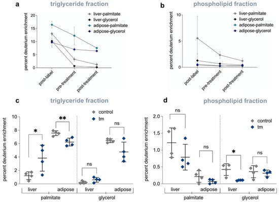 (a) Pre-labeling of triglycerides in control (DMSO) mice: percent deuterium enrichment of palmitate incorporated into triglycerides after 7 weeks of deuterium labeling (post-label), after a 2 week label free period (pre-treatment), and post 72 h treatment period (n = 3 per group). (b) Pre-labeling of phospholipids in control (DMSO) mice: percent deuterium enrichment of palmitate incorporated into phospholipids after 7 weeks of deuterium labeling (post-label), after a 2 week label free period (pre-treatment), and post 72 h treatment period (n = 3 per group). (c) Percent deuterium incorporated into palmitate and glycerol of triglycerides found in the liver or adipose after control (DMSO) or 1.5 mg/kg tunicamycin treatment after 72 h (n = 4 per group). (d) Percent deuterium incorporated into palmitate and glycerol of phospholipids found in the liver or adipose after control (DMSO) or 1.5 mg/kg tunicamycin treatment after 72 h (n = 4 per group). ns = no significance, * = <0.05, ** = <0.01.