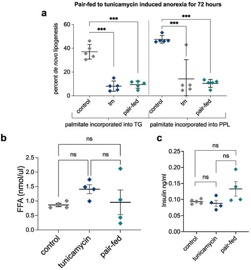 Hepatic de novo lipogenesis, free-fatty acid (FFA), and insulin at 72 h post treatment. (a) Hepatic de novo lipogenesis in pair-fed mice matched to tunicamycin treated mice. (b) Serum FFA at 72-h post treatment in control, tunicamycin, and pair-fed mice. (c) Serum insulin at 72 h post treatment in control, tunicamycin, and pair-fed mice. N = 5 mice per group. ns = no significance, *** = <0.001.