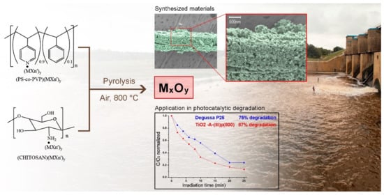 Over the past few decades, nanoscale particles have caused much interest due to their distinct chemical, physical and biological properties. A variety of nanoparticles (NPs) with various shapes such as spheres, nanotubes, nanohorns, and nanocages, made different materials, from organic dendrimers, liposomes, gold, carbon, semiconductors, silicon to iron oxide, have already been fabricated and explored in many scientific fields, including chemistry, material sciences, physics, medicine, and electronics [,,,,]. In this sense, a number of solution methods have been developed for the synthesis of metal and metal oxides nanoparticles [,], but few solid states have been reported []. The application of nanostructured materials to electronic solid-state devices or to high-temperature technology requires, however, adequate solid-state methods for obtaining nanostructured materials [,,,,]. For instance, recent studies reported that the evaporation of solvent to obtain Au nanoparticles in solid state (for adequate incorporation to a solid-state device) results in 3D Au superstructures with properties different to those of Au nanostructures []. Thus, solvent-less synthesis of nanostructures is highly significant due to its economical, eco-friendly, and industrially viable nature. Then, the development of new solid-state methods to prepare metallic nanostructured materials is a constant challenge. We have previously informed a new solid-state method to synthesize metallic nanostructures nanomaterials from the pyrolysis of metallic and organometallic derivatives of poly and oligophosphazene under air at 800 °C [,,,,]. Nanostructured metals (M), metal oxides (MxOy), and salts (MxPyOz, where P = malonates, succinates, etc.) are obtained, depending on the nature of the metal. Another method when the respective metallic or organometallic derivative is not possible to prepare uses mixtures such as MLn/[NP(O2C12H8)]3 [,,]. In this case, pure phase metallic nanoparticles are obtained. However, in several of these systems, the M or MxOy phase is accompanied by a phosphate phase. These methods have been discussed in detail in several publications [,,,,,,,,,,]. In this chapter, we will discuss a novel preparation method of metallic and metal oxides nanostructured particles starting from the macromolecular chitosan·MXn and PS-co-4-PVP·MXn precursor and subsequent solid-state pyrolysis at 800 °C under air (see Figure 1), including their application in environmental remediation. In addition, we will present a brief discussion of some recent solid-state methods to prepare metallic and metal oxides nanoparticles.