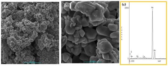 SEM image at two magnification levels (a,b) for Mn2O3 and their EDS analysis (c).