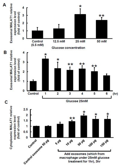 Effect of high glucose on exosomal MALAT1 expression in cultured macrophages. (A), Treatment with different glucose concentrations for 1 h. (B), Treatment with a glucose concentration of 25 mM for different periods of time. (C), Effects of exogenously administering different levels of macrophage-derived exosomes for 3 h on cytosolic MALAT1 expression. The macrophage-derived exosomes were extracted from macrophages under 25 mM glucose treatment for 1 h. * p < 0.01 vs. control. ** p < 0.05 vs. control. n = 4 per group.