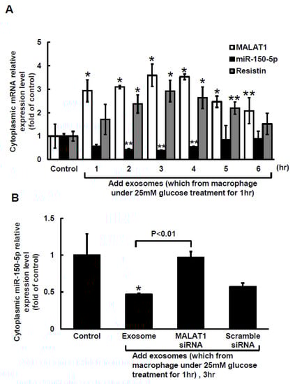 The decrease in miR-150-5p expression in cultured macrophages is mediated by macrophage-derived exosomes. (A), exogenous administration of macrophage-derived exosomes for different periods of time. The macrophage-derived exosomes were extracted from macrophages under 25 mM glucose treatment for 1 h. (B), Quantitative real-time PCR of cytoplasmic miR-150-5p mRNA levels. Scramble siRNA was the control siRNA. The macrophage-derived exosomes were extracted from macrophages under 25 mM glucose treatment for 1 h. * p < 0.01 vs. control. ** p < 0.05 vs. control. n = 4 per group.