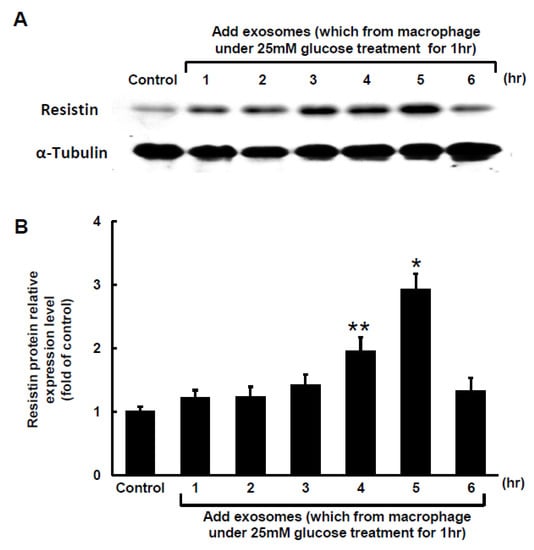 2.2. Macrophage-Derived Exosomes Decreased miR-150-5p and Increased Resistin Expressions in Macrophages