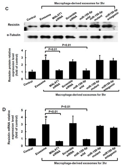 The Clustal W method in MegAlign software (DNASTAR, Madison, WI, USA) was used to search for the MALAT1 target microRNA (miR) and discovered that a mouse MALAT1 matching site for miR-150-5p was located between 5243 bp and 5265 bp on the mouse MALAT1 gene loci. The 50-µg macrophage-derived exosomes under 25 mM glucose treatment significantly increased cytoplasmic MALAT1 mRNA levels in macrophages, but the miR-150-5p cytoplasmic mRNA levels significantly decreased after treatment with macrophage-derived exosomes without glucose. Cytoplasmic resistin mRNA levels showed a pattern similar to that of MALAT1 under macrophage-derived exosome treatment (Figure 2A). Silencing MALATA1 with MALAT1 siRNA significantly reversed cytoplasmic miR-150-5p expression in macrophages (Figure 2B). The scramble MALAT1 siRNA did not significantly affect cytoplasmic miR-150-5p mRNA expression under macrophage-derived exosome treatment. Exosomes derived from macrophages under 25 mM glucose treatment significantly increased resistin protein expression for 4 to 5 h, but then the resistin levels returned to normal after 6 h (Figure 3A,B). MALAT1 siRNA significantly reduced resistin protein and mRNA expression in macrophages treated with macrophage-derived exosomes (Figure 3C,D). The scramble MALAT1 siRNA did not significantly affect resistin protein and mRNA expression under macrophage-derived exosome treatment. Overexpression of wild-type miR-150-5p significantly reduced resistin protein and mRNA expression induced by macrophage-derived exosomes, while overexpression of the mutant miR-150-5p or the antagomir of miR150-5p did not reduce resistin protein and mRNA expression induced by macrophage-derived exosomes. These results indicated that macrophage-derived exosomes under high glucose treatment increased MALAT1 expression but decreased miR150-5p expression to enhance resistin expression in macrophages.
