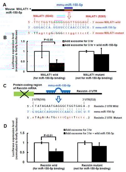 Effect of miR-150-5p on MALAT1 and resistin luciferase activity in macrophages treated with macrophage-derived exosomes. (A), Sequence of the mouse MALAT1 3′UTR target site for miR-150-5p binding (nucleotides 5243 to 5265 bp). (B), MALAT1 3′UTR luciferase activity under macrophage-derived exosome treatment with wild type or mutant MALAT1. (C), Sequence of the mouse resistin 3′UTR target site for miR-150-5p binding, which is located on the resistin 3′UTR (nucleotides 510 to 532 bp). (D), Resistin 3′UTR luciferase activity under macrophage-derived exosome treatment with wild type or mutant resistin.