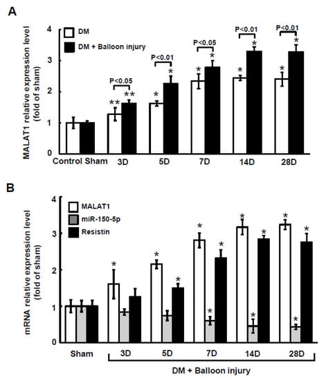 Effect of carotid artery balloon injury on MALAT1 expression in diabetic rats. (A), Quantitative real-time PCR analysis of MALAT1 levels in arterial tissue with or without carotid artery balloon injury in diabetic rats after different periods of time. (B), Quantitative real-time PCR analysis of MALAT1, miR-150-5p, and resistin mRNA levels in arterial tissue after carotid artery balloon injury for different periods of time. * p < 0.01 vs. control. ** p < 0.05 vs. control. n = 5 per group.