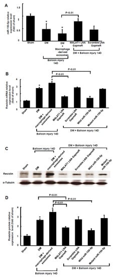 Macrophage-derived exosomal MALAT1-mediates the reduction of miR-150-5p expression after carotid artery balloon injury in diabetic rats. (A), Quantitative real-time PCR analysis of miR-150-5p levels in arterial tissue at 14 days after carotid artery balloon injury in diabetic rats. The macrophage-derived exosomes were extracted from macrophages under 25 mM glucose treatment for 1 h. Scramble siRNA was the control siRNA. (B), Quantitative real-time PCR of resistin mRNA levels in arterial tissue at 14 days after carotid artery balloon injury in diabetic rats. The macrophage-derived exosome was extracted from macrophages under 25 mM glucose treatment for 1 h. Scramble LNA GapmeR is a control siRNA. (C), Representative Western blots for resistin and α-tubulin protein levels in arterial tissues at 14 days after carotid artery balloon injury in diabetic rats. (D), Quantitative analysis of resistin protein levels. Scramble LNA GapmeR was the control siRNA. * p < 0.01 vs. control. n = 5 per group.