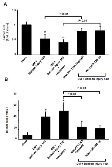Male Wistar rats (230–260 g), aged 16 weeks, were injected with a single intraperitoneal injection of streptozotocin at 90 mg/kg (STZ, Sigma, St. Louis, MO, USA) to become diabetic []. Diabetes was confirmed by the presence of hyperglycemia (19 mmol/L) for at least 1 week. The balloon injury of the carotid artery was performed 1 week after STZ injection. Adult Wistar rats were anaesthetized with isoflurane (2%) and subjected to balloon catheter injury of the right carotid artery. Briefly, a 2F Forgarty balloon catheter (Biosensors International) was inserted through the right external carotid artery, inflated, and passed three times along the length of the isolated segment (1.5–2 cm in length); then the catheter was removed. MALAT1-contained exosomes (70 µg/150 uL), MALAT1 LNA GapmeR at 50 nM, or 10µg of plasmid DNA was injected to the segment, and electric pulses using CUY21- EDIT Square Wave Electroporator (Nepa Gene) were administered with five pulses and five opposite polarity pulses at 250 V/cm, 50 ms duration, 75 ms interval using Parallel fixed platinum electrode (CUY610P2–1, 1 mm tip, 2 mm gap). The injected MALAT1-containing exosomes or MALAT1 LNA GapmeR was incubated for 10 min. After incubation, unbound MALAT1-containing exosomes or MALAT1 LNA GapmeR was aspirated. The carotid artery was then tied off, and the wound was closed. The rats were sacrificed at 3 to 28 days after balloon injury and the carotids were perfusion fixed at constant physiologic pressure with 4% paraformaldehyde. The vessels were excised and embedded in paraffin blocks, and two cross-sections were cut at positions 1 and 2 cm upstream of the carotid bifurcation. The carotid artery was harvested and fixed in 10% formaldehyde and sliced into 5 μm paraffin sections. Then immunofluorescence staining was performed as previously described []. Intimal, medial, and adventitial cross-sectional areas were measured by image software (Nikon NIS-Elements, Tokyo, Japan). Animal experiments were approved by the Institutional Animal Care and Use Committee of Shin Kong Wu Ho-Su Memorial Hospital (Approval number: 109MOST0001) and carried out in accordance with the Guide for the Care and Use of Laboratory Animals.
