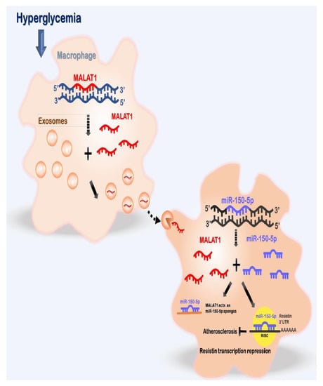 Macrophage-derived exosomes play a crucial role in vascular disease [,]. Wang et al. reported that macrophage-derived exosomes were involved in the pathogenesis of abdominal aortic aneurysms []. Exosomes are stable, safe, and effective carriers that contain many crucial proteins and microRNAs that promotes vascular disease. Our study indicates that macrophage-derived exosomes containing MALAT1 may serve as a novel cell-free approach for the treatment of vascular disease caused by diabetes mellitus. The effect of high glucose on MALAT1, miR-150-5p, and resistin in macrophages is summarized in Figure 8. A better understanding of the detailed mechanisms associated with the therapeutic targets of MALAT1 under hyperglycemic conditions will provide new insights into the therapeutic development of vascular disease that is frequently encountered in patients suffering from diabetes mellitus. Macrophages have different phenotypes under different stimulation. M1 macrophages are pro-inflammatory and M2 macrophages are anti-inflammatory []. It has been reported that exosome-guided phenotypic switch of MI to M2 macrophages could improve wound healing []. In this study, we did not check our macrophages phenotype. Based on our study findings, we speculate that our macrophage phenotype is M1 because it aggravates vascular disease. Glycemic control is critical to diabetes management because uncontrolled diabetes is associated with significant subclinical vascular disease and an increased risk for cardiac events as compared with controlled diabetes [].