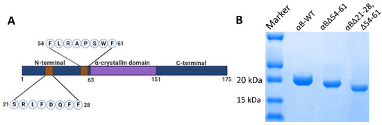 (A). Schematic representation of αB-crystallin showing central α-crystallin domain flanked by N-terminal domain and C-terminal domain and deleted 21–28 and 54–61 sequences. (B). SDS-PAGE profile of purified recombinant αB-WT, αBΔ54–61, and αBΔ21–28, Δ54–61 crystallins showing variability in monomeric size.