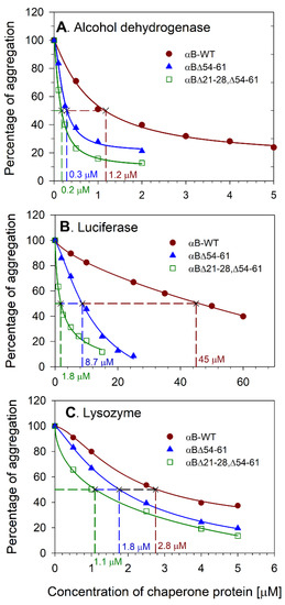 Comparison of anti-aggregation activities of αB∆21–28, ∆54–61, αB-WT, and αB∆54–61. Relative aggregation of (A) alcohol dehydrogenase, (B) luciferase, and (C) lysozyme in 0.25 mL assay buffer in the presence of different concentrations of chaperone proteins was estimated by monitoring the light scattering at 360 nm on a plate reader as described under methods. The result shown is representative of three independent experiments. The EC50 (effective chaperone protein concentration required to suppress the substrate protein aggregation by 50%) values are shown in the figure. The substrate protein aggregation (scattering at 360 nm) in the absence of chaperone protein is considered 100% aggregation. The aggregation of substrate protein shown at each concentration of chaperone protein tested is relative to the aggregation of substrate protein without the chaperone protein.