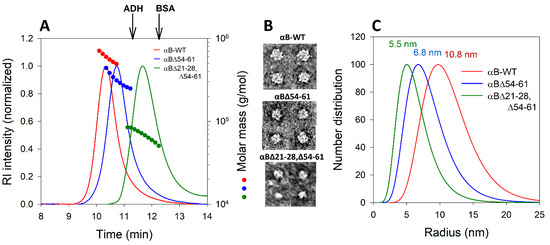 (A) Multi-angle light scattering analysis of αB-WT, αBΔ54−61, and αBΔ21–28, Δ54–61. Proteins (0.1 mg in 0.25 mL phosphate buffer) were incubated at 37 °C for one hour before analysis. Molar mass distribution across the refractive index (RI) peaks were analyzed using ASTRA software from the MALS data. (B) Negatively stained TEM micrograph particles of αB-WT, αBΔ54–61, and αBΔ21–28, Δ54–61 crystallins show the size and structural variability. (C) Hydrodynamic radii (Rh) were measured using 25 µM of protein in 0.25 mL PBS (pH 7.4) in a NanoBrook Omni in 8.5 mm UV micro cuvette (Brand Tech. Inc., Essex, CT, USA). The data shown is a representative profile of three independent analyses.