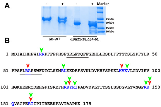 SDS-PAGE analysis of αB-WT and αB∆21–28, ∆54–61 after limited proteolysis using trypsin. (A). Twenty microgram aliquots of 1 mg/mL αB-WT and αB∆21–28, ∆54–61 were incubated with (+) or without (−) trypsin (200:0.5 protein to protease w/w) at 37 °C for 10 min. The reaction was terminated with the addition of trifluoroacetic acid to a final concentration of 0.1%. The extent of proteolysis was evaluated on a 4–20% SDS-PAGE gel. (B). Representation of tryptic cleavage sites in αB-WT and αB∆21–28, ∆54–61 observed from the samples digested for 10 min and subjected to LC-MS analysis. Arrow indicates the cleavage sites in the protein sequences (red = αB-WT; green = αB∆21–28, ∆54–61).