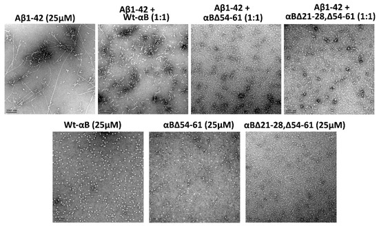 TEM micrographs of human Aβ1–42 with and without αBΔ21–28, Δ54–61 after 72 h of incubation in PBS buffer at 37 °C without shaking. Negatively stained (with 2% uranyl acetate) sample images were captured using a JEOL JEM 1400 electron microscope (JEOL Inc., Peabody, MA, USA). The scale bar is equal to 100 nm (25× magnification).