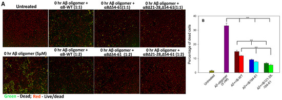 It is well-known that Aβ1–42 peptide induces cell toxicity via oxidative stress [17]. To determine the effect of αBΔ21–28, Δ54–61 crystallin on Aβ1–42 peptide-induced cellular toxicity, we treated the ARPE-19 cells with hexafluoro-2-propanol (HFIP)-treated Aβ1–42 peptide and alpha B-crystallins in 1:1 and 1:2 molar ratios. Dead and live cells were stained with an EarlyTox cell integrity kit after 24 h. Aβ1–42 peptide-treated cells showed 33.14 ± 1.8% dead cells. In the presence of αB-WT (in 1:1 ratio), Aβ1–42-induced cell death was reduced to 15.00 ± 0.9%, whereas at 1:2 ratio of Aβ1–42 and αB-WT, the dead cells were 11.89 ± 0.4% (Figure 7). These values equal 55 and 64% protection of Aβ1–42-susceptible cells by αB-WT, respectively. In the presence of αB∆54–61 (1:1 ratio), Aβ1–42-induced cell death was reduced to 9.15 ± 0.3% (72% protection), and at twice the concentration of αB∆54–61, the cell death was reduced to 7.65 ± 0.4% (77% protection). Interestingly, cells simultaneously treated with 1:1 and 1:2 ratios of Aβ1–42 and αBΔ21–28, Δ54–61 showed 6.65 ± 0.41% and 5.41 ± 0.55% (equal to 80% and 84% protection, respectively) of cell death as shown in Figure 7, a significantly (p < 0.005) higher protection from cell death compared to αB-WT and αBΔ54–61. Overall data suggested that αBΔ21–28, Δ54–61 crystallin protected the Aβ1–42 peptide-induced toxicity more effectively than the αB-WT and αBΔ54–61 proteins. Results were consistent with three independent experiments and repeats.