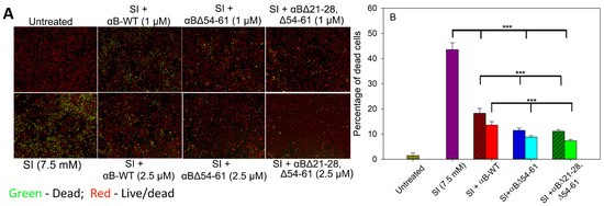 SI has also been shown to be toxic to cells and causes the death of retinal cells in many mammals [43,44]. In the present study, SI at 7.5 mM showed toxic effects on the cells after 24 h (Figure 8). However, the cells co-treated with αB∆21–28, ∆54–61 showed a significant reduction in SI toxicity, evidenced by a greater degree of survival of cells (Figure 8). Furthermore, the activity of αB∆21–28, ∆54–61 was superior to that of αB-WT or αB∆54–61.