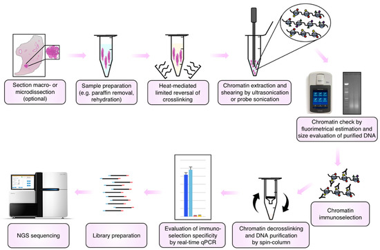 In the following sections, we aim to describe in detail and compare the different experimental strategies used to achieve chromatin profiling in FFPE samples, from the preliminary evaluation of the specimens to chromatin extraction and immunoselection, including the final quality tests that might precede the NGS sequencing.