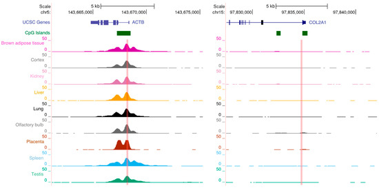 Identification of H3K4me3 control regions for the evaluation of the specificity of the immunoselection by real-time qPCR. Regions known to be enriched or not enriched can be used for antibody titration and to evaluate the specificity of the immunoselected DNA prior to library preparation and sequencing. Snapshots of mouse H3K4me3-enriched (ACTB) and not enriched (COL2A1) gene promoters are shown as example. ChIP-Seq data are from the ENCODE project and were taken from UCSC Genome Browser (http://genome.ucsc.edu (accessed on 7 November 2021)). The sequences we used to amplify as a control of specificity of H3K4me3 experiments on mouse tissues are indicated by the light-red vertical bars.