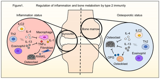 Classically, type 1 immunity and type 2 immunity are differentiated. Type 1 immunity comprises T helper 1 (Th1) cells, type 1 innate lymphoid cells (ILC1s), and natural killer (NK) cells, which induce cytotoxicity and phagocytosis by secreting interferon gamma (IFNγ). Type 2 immunity is exerted by T helper 2 (Th2) cells, eosinophils, mast cells, basophils, Th9 cells, and the recently discovered type 2 innate lymphoid cells (ILC2s) (Figure 1). A third type of immunity is characterized by Th17 cells and type 3 innate lymphoid cells (ILC3s). These immune cells communicate with each other and regulate inflammation to adjust and balance immune responses [1]. In inflammatory diseases such as rheumatoid arthritis (RA) demonstrating proliferative synovitis and bone destruction, innate and adaptive immunity are involved in the pathology [2]. Activated macrophages secrete interleukin (IL)-1, IL-6, and tumor necrosis factor (TNF)α, which stimulate synovial fibroblasts to express receptor activator of NF-κB ligand (RANKL) in RA [3]. Th17 cells secrete IL-17 to stimulate macrophages and synovial fibroblasts [2]. As RANKL is a key molecule for osteoclast differentiation, bone metabolism shifts toward bone destruction in the inflammatory status. Recent studies uncovered the regulation of arthritis and bone metabolism by Type 2 immune cells (Figure 1).