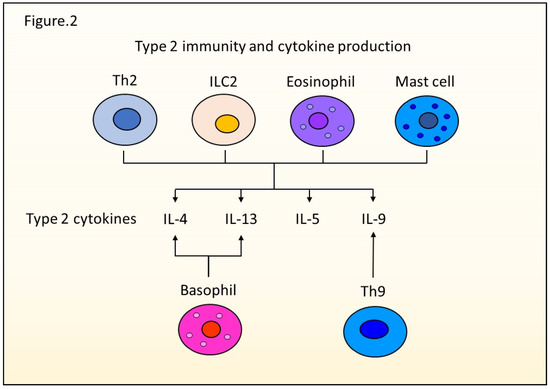 Dendritic cells (DCs) initially prime and stimulate naïve T cells, and CD4+ T cells differentiate into Th2 cells expressing the GATA-binding protein 3 gene (GATA-3) [4,5]. Th2 cells can produce type 2 cytokines such as IL-4, IL-5, IL-9, and IL-13. Several immune cells such as Th2 cells, Th9 cells, eosinophils, mast cells, and basophils are known to exert type 2 immunity by producing those cytokines (Figure 2). Type 2 immunity has two major functions: defending against helminth infection by enhancing barrier function and protecting against autoimmune diseases [6,7,8]. For instance, IL-4 and IL-13, key mediators of type 2 immunity, are essential to neutralize worms, such as the gastrointestinal parasite, Nippostrongylus brasiliensis. Although this worm was expelled in IL-4 knockout mice, IL-4 receptor chain-deficient mice and Stat6-deficient mice failed to expel it. IL-13, rather than IL-4, is essential to expel the worm via Stat6 signaling [6].