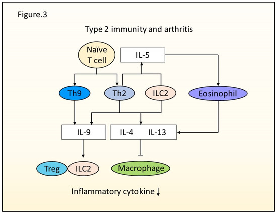 Type 2 immunity and arthritis. Naive T cells differentiate into Th2 cells by the activation of GATA3 genes. Th2 cells and ILC2s produce IL-4 and IL-13, which suppress macrophage activation in the inflammatory status. Th2 cells and ILC2s also secrete IL-5, activating eosinophils to generate IL-4 and IL-13. Naive T cell-derived Th2 and Th9 can produce IL-9. IL-9 enhances the interaction of ILC2s and Tregs to alleviate inflammation. ILC2s regulate both the initiation and resolution of arthritis.