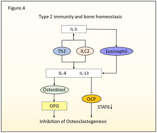Bone consists of bone-resorbing osteoclasts, bone-forming osteoblasts, and structural osteocytes. Osteoblasts are mononucleated cells derived from mesenchymal stem cells, while osteoclasts are multinucleated cells originating from hematopoietic progenitor cells. Bone remodeling, in which the matrix produced by osteoblasts repair resorbed bone surfaces is essential for maintaining bone homeostasis [83]. Osteoporosis is caused by the age-related imbalance of hormones, inflammation, or tumorigenesis. Bone turnover is determined by the balance of osteoclasts and osteoblasts, with a shift toward bone resorption occurring in osteoporosis. Accelerated bone resorption leads to fragility and insufficiency fractures. The balance between osteoclasts and osteoblasts is adjusted by the RANKL/RANK/OPG system. Osteoprotegerin (OPG) binds to RANKL and blocks the binding of RANKL to RANK, which leads to the inhibition of osteoclast differentiation. Single nucleotide polymorphism in TNFRSF11B, which encodes OPG, is associated with postmenopausal osteoporosis [84,85,86]. The involvement of immune cells in bone biology has been investigated. Human and murine Treg cells inhibit osteoclast differentiation [87,88]. It was suggested that the suppression of osteoclasts was mediated by direct cell–cell interactions or in an indirect cytokine-dependent manner. It has been uncovered that various immune cells, including T cells, B cells, and innate immune cells, regulate bone metabolism and homeostasis. This section provides an overview of the crosstalk that occurs between bone metabolism and type 2 immunity, with a focus on the type 2 effector cytokines (Figure 4).
