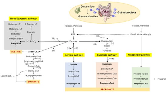Pathways involved in the biosynthesis of SCFAs from dietary fiber and carbohydrate fermentation by the colonic microbiota. The three major SCFAs are: (1) acetate which originates via the Wood–Ljungdahl pathway or acetyl-CoA; (2) butyrate synthesized from two molecules of acetyl-CoA; (3) propionate from PEP involving the acrylate pathway or the succinate pathway or the propanediol pathway after microbial transformation of fucose and rhamnose. Abbreviations: PEP—phosphoenolpyruvate; DHAP—dihydroxyacetone phosphate. Adapted from Kho et al. [].