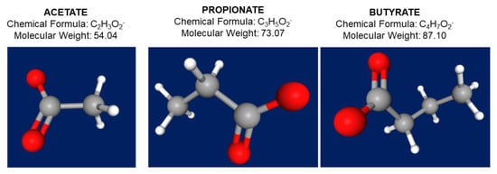 Chemical formula, molecular weight, and 3D structure of the three main short chain fatty acids acetate (C2), propionate (C3), and butyrate (C4). In the 3D structure, atoms appear as hydrogen in white color, carbon as grey color, and oxygen as red color. https://pubchem.ncbi.nlm.nih.gov/ (accessed 18 January 2022).