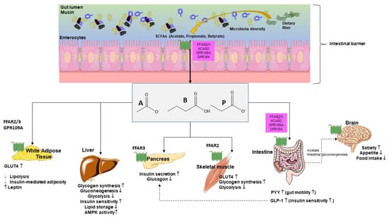 Several systemic effects of SCFAs originate from the intracellular effects of SCFAs which bind the G protein-coupled receptors (GPCRs), such as the free fatty acid receptor 2 (FFAR2, earlier known as GPR43) and FFAR3 (earlier known as GPR42), as well as GPR109A/HCAR2 (hydrocarboxylic acid receptor) and GPR164. These receptors are expressed in colonocytes, enterocytes, and in several other cells in the body, including neural cells. At the level of enteroendocrine L cells, the SCFAs-mediated stimulation of receptors is associated with the release of two anorexic hormones, glucagon-like peptide-1 (GLP-1) and the peptide YY (PYY). Notably, this pathway is independent of the bile acid pathway involving the ileal membrane receptor G protein-coupled bile acid receptor 1 (GPBAR-1) [,,]. The SCFA-related pathways of hormone release are associated with several effects on appetite and food intake via systemic circulation or vagal afferents [,]. In addition, the incretin GLP-1 slows gastric emptying and gut transit, helps energy absorption [], and enhances glucose-dependent insulin release []. Additional effects on gut motility likely involve the SCFAs-induced serotonin release from enterochromaffin cells [].