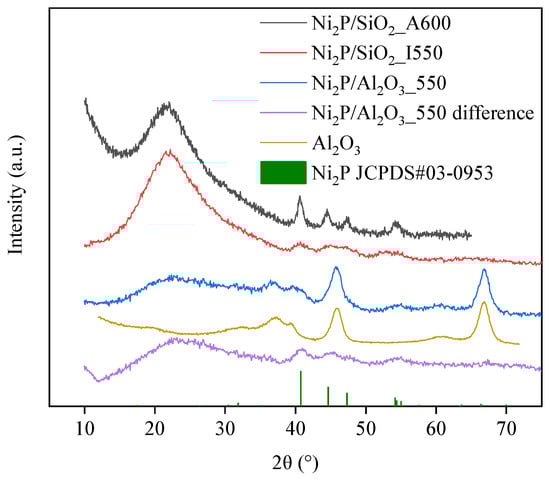 XRD patterns of some nickel phosphide catalysts are presented in Figure 1. All XRD curves show the characteristic signals of the Ni2P phase: 2θ = 40.7°, 44.5°, 47.3°, 54.1°, and 55.0° (a = b = 0.5859 nm, c = 0.3382 nm, α = β = 90°, γ = 120°; JCPDS #03-0953). In addition, the Ni2P/SiO2 and Ni2P/Al2O3 samples contain diffraction peaks of the support: the broad line at 2θ~15–30 from the amorphous SiO2 or characteristic peaks from γ-Al2O3 (PDF No. 29-0063). The average crystallite size of the Ni2P particles (DXRD) estimated using the Scherrer equation is 10, 4, and 4 nm in Ni2P/SiO2_A600, Ni2P/SiO2_I550, and Ni2P/Al2O3_550, respectively.