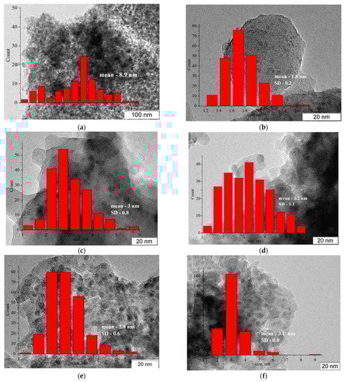 TEM data of (a) Ni2P/SiO2_A600, (b) Ni2P/SiO2_I450, (c) Ni2P/SiO2_I500, (d) Ni2P/SiO2_I550, (e) Ni2P/Al2O3_550, and (f) Ni2P/Al2O3_600.