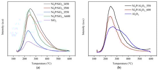 NH3-TPD curves of (a) Ni2P/SiO2 and (b) Ni2P/Al2O3 samples, as well as supports.