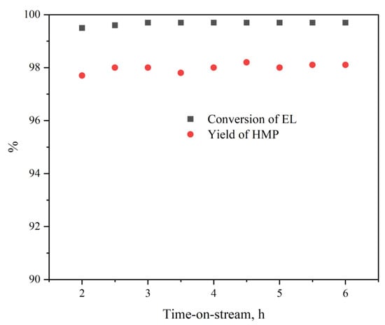The formation of dihexylamine during the reaction is probably associated with the condensation of n-hexylamine molecules on the catalyst surface in the presence of hydrogen. This reaction is competitive with the imine formation, which leads to a decrease in the yield of HMP at a ratio EL/HA~1. The slight excess of HA at the ratio of EL/HA equal to 1:1.2 resulted in the increase in HMP yield to 98% (Table 2, entry 17). The Ni2P/SiO2_A600 catalyst shows good stability under these reaction conditions. The time-dependent study of the reductive amination of EL with HA demonstrates that the EL conversion and HMP yield remained unchanged for 6 h (Figure 4).